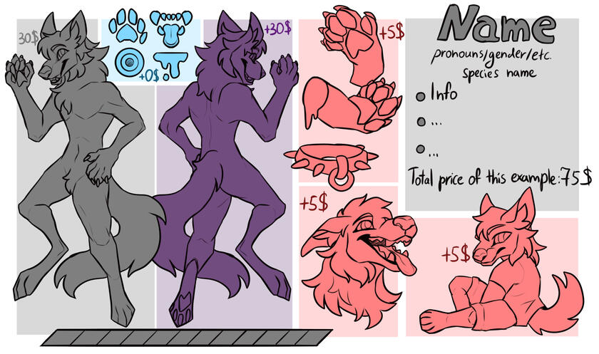 Fullbody of a character without shading. Includes color palette, information box and other details. Keep in mind, you should have at least sketch of the character (or photo of the pet if you want a reference of them). I don't do custom adopts yet. However, I can do changes to your design if you ask